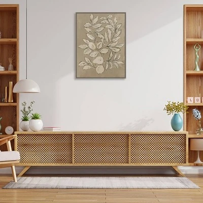 ART DESCRIPTION: Tangled branches shuffle upward, trying to get to the last bit of ancient sunlight. This sepia-toned sketch of a few leafy branches combines modern elegance with soothing neutral colors to create a warm, timeless feeling. This Amanti Art canvas art print was created by Asia Jensen and printed by Amanti Art in Madison WI. The canvas is stretched by hand and finished with a float frame. Individually made using traditional custom framing techniques, it has the quality you would expect from your local frame shop. Because of our attention to detail and focus on artistry, architects, interior designers, and homeowners alike choose this framed canvas artwork to create beautiful living spaces.