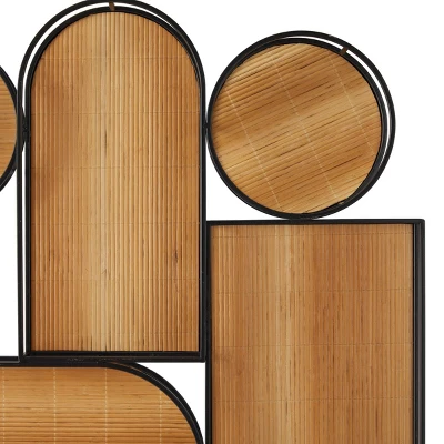 - A brown abstract wall decor consisting of round and semi-oval structure furnished with bamboo strips and raised black metal frames