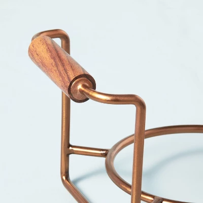 Bring a stunning update to your dining setting with this Set of 3 Buffet Dish Holder Caddies from Hearth & Hand™ with Magnolia. This set includes three buffet dish holder caddies to hold different-sized dinner plates, snack plates and dessert plates. Made from stainless steel, these dish holder caddies feature a round open base to stack different dishes to bring organization to your space, while the raised bottom prevents the dishes from coming in contact with the countertop or buffet sideboard surface. Showcasing a glossy copper finish for classic style, they feature acacia wood handles for easy portability while adding rustic charm to your buffet spread.