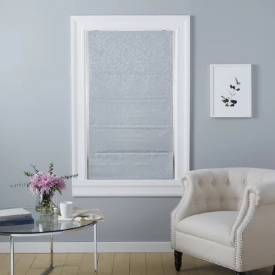 The Exclusive Home Curtains Bolan Botanical Total Blackout Roman Shade in silver features a tonal jacquard leaf pattern on high-quality, silk-look fabric and offers an elegant addition to your windows. This cordless shade has a foam blackout backing provides maximum privacy and blocks sunlight. A handle makes it easy to pull it up and down. The classic design is easy to coordinate with any decor style. Hang the shade in your living room, dining room, kitchen, office, bedroom, or entryway.