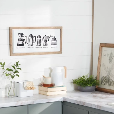- This coffee wall art has a glossy white interior finish with black illustrations and a light blonde-colored wood frame