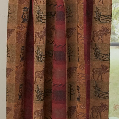 The Primitive High Country Tiers feature a pretty Herringbone plaid in warm tones of red, mustard, chocolate & black. Woven into the plaid are images of moose, bears, pine trees, arrowheads & other symbols of the great outdoors. This unique pattern is perfect for your rustic, lodge, or primitive decor. Pair with a coordinating valance for a more dramatic appeal.