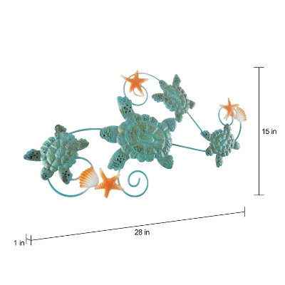 The Swimming Sea TurtlesWall Art will add a whimsical seaside touch to any home decor! Featuring an intricately crafted openwork design of scrolled waves, and 4 swimming turtles with starfish and seashell accents, this hand painted 3D metal artwork is a unique ocean sea life inspired piece that will make an attractive addition to any home.It will beautifully complement any design style, from vintage nautical or rustic coastal cottage, to modern contemporary. With a built-in wall hanger on the back and mounting hardware included, this wall sculpture will look fantastic in the living room, bedroom, bathroom, hallway, foyer, or any area of the home!