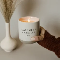 Aromatherapy meets luxury in our Cashmere and Vanilla soy candle. The rich, creamy aroma of milky coconut and bourbon vanilla meets the warmth of soft cashmere and sandalwood, with just a touch of musk in this decadent candle. Hints of Frangipani add exotic floral notes to round out our newest luxurious and timeless scent that everyone will love.