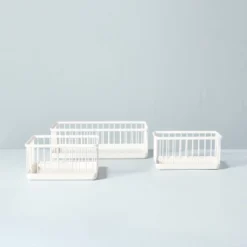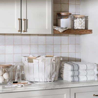 Make laundry day less stressful with this Wire & Fabric Laundry Hamper from Hearth & Hand™ with Magnolia. Designed in a round silhouette with a wired metal frame, this laundry hamper features a soft inner fabric liner to keep your laundry hidden from view. The open-top design comes in handy for sorting through laundry, while the two side wooden handles make it easy to carry. Featuring a white metal frame with a cream fabric liner and natural wooden handles, this laundry basket brings a dash of style to your laundry room.