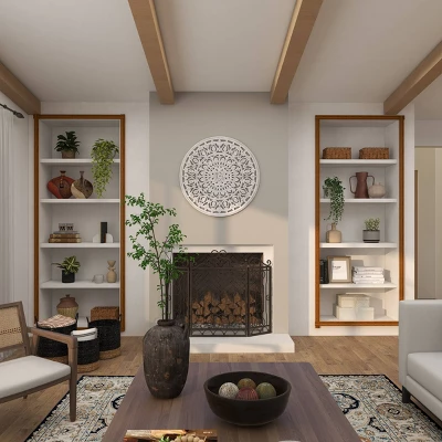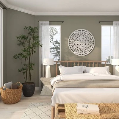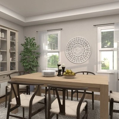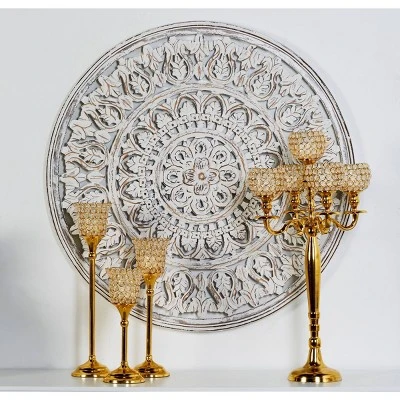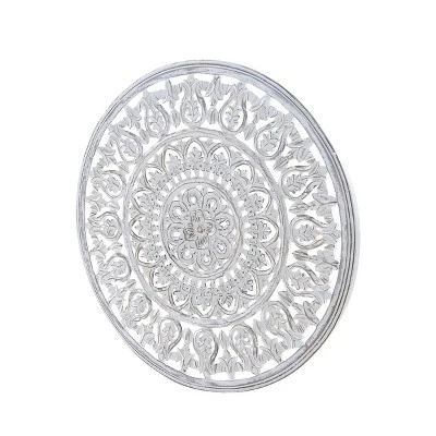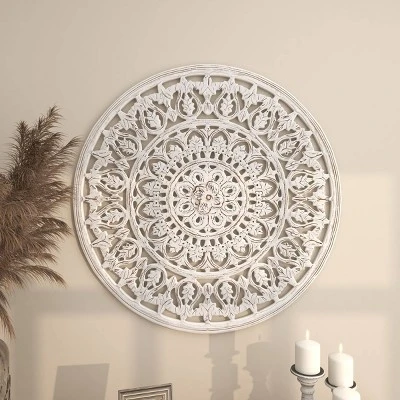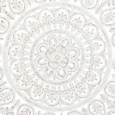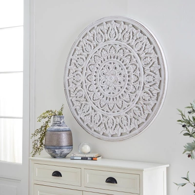 This carved wooden wall panel will work as a nice background or as a centerpiece when displayed on the walls of your traditional style inspired home. This item ships in 1 carton. Large, round, hand-carved wooden floral wall art. Due to the handmade nature of this item, no two will be alike, there will be slight differences in shape, size, and color. Can be hung vertically using the keyholes on the back; nails and screws not included. Suitable for indoor use only. This item ships fully assembled in one piece. Made in India. This is a single white colored wall sculptures. Traditional style.
