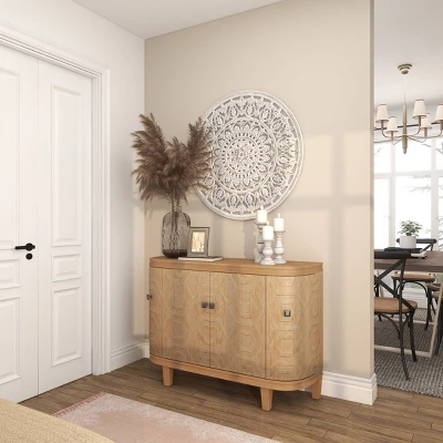 - Carved wooden panel wall art features a traditional style inspired design with an elaborate carving feature in a round white profile